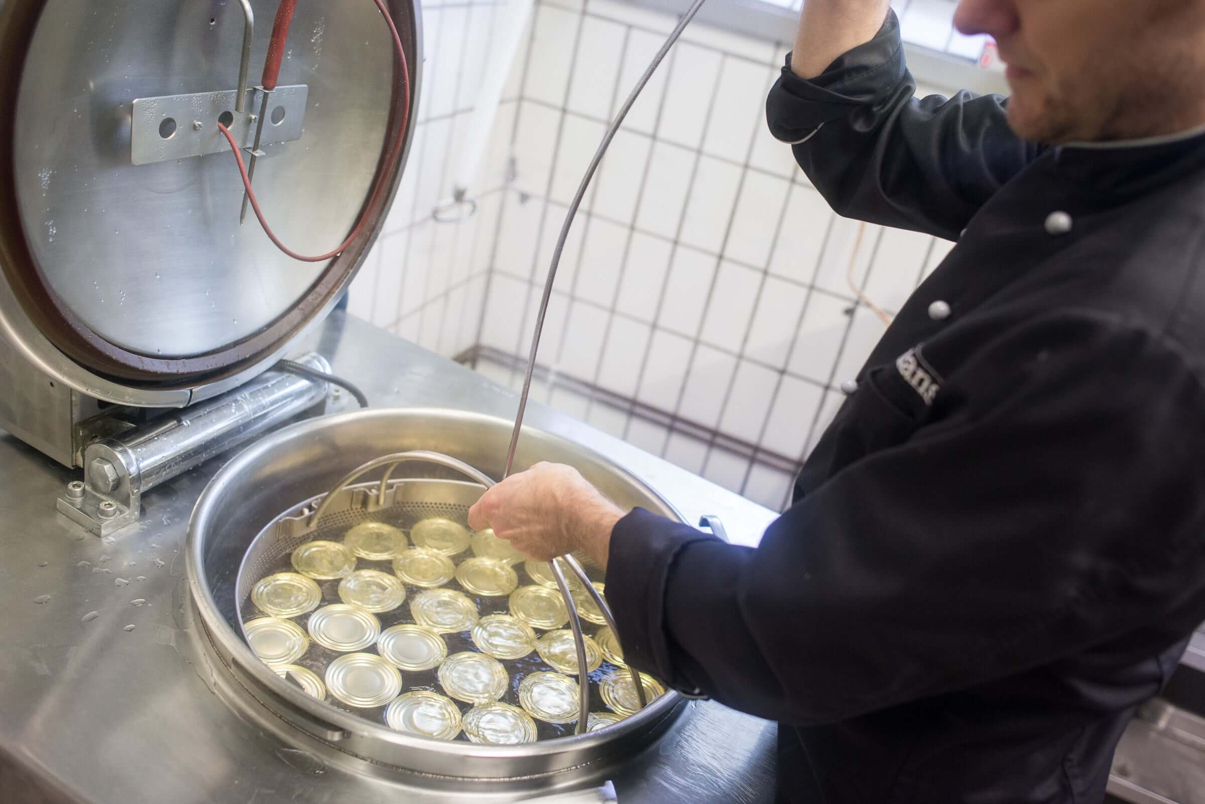 In einem Kessel werden die Langhans-Produkte unter Zugabe von Druck haltbar gemacht. So entsteht eine sogennante Vollkonserve. Diese Art der Konservierung garantiert dafür, dass die Produkte mindestens zwei Jahre haltbar sind. Hierfür ist keine Kühlung notwendig - eine Aufbewahrung bei normaler Zimmertemperatur ist völlig ausreichend. Das ist nicht nur im Alltag, sondern auch auf Reisen ungemein praktisch!